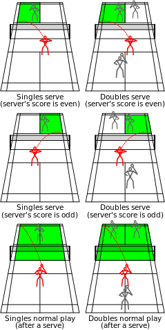 In doubles, if the serving side wins a rally, the same player continues to serve, but he/she changes service courts so that she/he serves to a different opponent each time. If the opponents win the rally and their new score is even, the player in the right service court serves; if odd, the player in the left service court serves. The players' service courts are determined by their positions at the start of the previous rally, not by where they were standing at the end of the rally. A consequence of this system is that, each time a side regains the service, the server will be the player who did not serve last time.