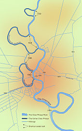 Bangkok's major canals are shown in this map detailing the original course of the river and its shortcut canals.