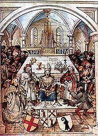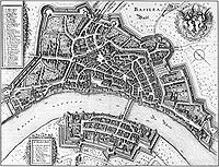 In 1501 Basel joined the Swiss Confederation as its eleventh canton, separating de facto from the Holy Roman Empire, and began the construction of the city council building. The bishop's seat remained in Basel until 1529, when the city became Protestant under Oecolampadius. The bishop's crook was however retained as the city's coat of arms. The first edition of Christianae religionis institutio ( Institutes of the Christian Religion - John Calvin's great exposition of Calvinist doctrine) was published at Basel in March 1536.