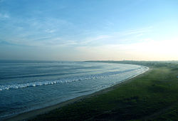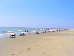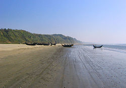 Kuakata beach in Bangaldesh, one of the sea beaches of Bay of Bengal where from same location both sunrise and sunset at sea can be observed. Kanyakumari in Tamil Nadu, India has a beautiful beach from where both sunrise and sunset can be seen.
