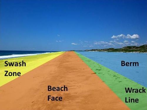 4. Berm: Nearly horizontal portion that stays dry except during extremely high tides and storms. May have sand dunes.