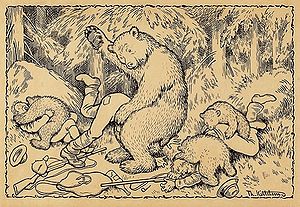 This kind of attitude is reflected in the traditional Russian fairy tale " Morozko", whose arrogant protagonist Ivan tries to kill a mother bear and her cubs — and is punished and humbled by having his own head turned magically into a bear's head and being subsequently shunned by human society.