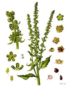 Beta vulgaris is a herbaceous biennial or rarely perennial plant with leafy stems growing to 1-2 m tall. The leaves are heart-shaped, 5-20 cm long on wild plants (often much larger in cultivated plants). The flowers are produced in dense spikes, each flower very small, 3-5 mm diameter, green or tinged reddish, with five petals; they are wind-pollinated. The fruit is a cluster of hard nutlets.