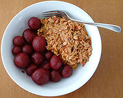 The usually deep-red roots of garden beet are eaten boiled either as a cooked vegetable, or cold as a salad after cooking and adding oil and vinegar. A large proportion of the commercial production is processed into boiled and sterilised beets or into pickles. In Eastern Europe beet soup, such as cold borscht, is a popular dish. Yellow-coloured garden beets are grown on a very small scale for home consumption.