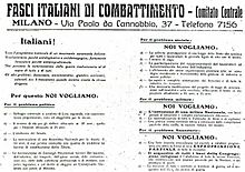 Professor Benito Mussolini, ... 38, revolutionary socialist, has a police record; elementary school teacher qualified to teach in secondary schools; former first secretary of the Chambers in Cesena, Forli, and Ravenna; after 1912 editor of the newspaper Avanti! to which he gave a violent suggestive and intransigent orientation. In October 1914, finding himself in opposition to the directorate of the Italian Socialist party because he advocated a kind of active neutrality on the part of Italy in the War of the Nations against the party's tendency of absolute neutrality, he withdrew on the twentieth of that month from the directorate of Avanti! Then on the fifteenth of November [1914], thereafter, he initiated publication of the newspaper Il Popolo d'Italia, in which he supported – in sharp contrast to Avanti! and amid bitter polemics against that newspaper and its chief backers – the thesis of Italian intervention in the war against the militarism of the Central Empires. For this reason he was accused of moral and political unworthiness and the party thereupon decided to expel him ... Thereafter he ... undertook a very active campaign in behalf of Italian intervention, participating in demonstrations in the piazzas and writing quite violent articles in Popolo d'Italia ...