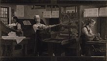 Benjamin Franklin (centre) at work on a printing press. Reproduction of a Charles Mills painting by the Detroit Publishing Company.