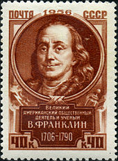 A commemorative stamp of the Union of Soviet Socialist Republics issued in honour of Benjamin Franklin's contributions to politics and science on the 250th anniversary of his birth in 1956