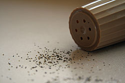 Dried ground pepper is one of the most common spices in European cuisine and its descendants, having been known and prized since antiquity for both its flavour and its use as a medicine. The spiciness of black pepper is due to the chemical piperine. Ground black peppercorn, usually referred to simply as "pepper", may be found on nearly every dinner table in some parts of the world, often alongside table salt.