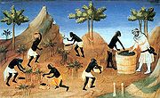 Black pepper is grown in soil that is neither too dry nor susceptible to flooding, moist, well-drained and rich in organic matter. The plants are propagated by cuttings about 40 to 50 centimetres long, tied up to neighbouring trees or climbing frames at distances of about two metres apart; trees with rough bark are favoured over those with smooth bark, as the pepper plants climb rough bark more readily. Competing plants are cleared away, leaving only sufficient trees to provide shade and permit free ventilation. The roots are covered in leaf mulch and manure, and the shoots are trimmed twice a year. On dry soils the young plants require watering every other day during the dry season for the first three years. The plants bear fruit from the fourth or fifth year, and typically continue to bear fruit for seven years. The cuttings are usually cultivars, selected both for yield and quality of fruit. A single stem will bear 20 to 30 fruiting spikes. The harvest begins as soon as one or two berries at the base of the spikes begin to turn red, and before the fruit is mature, but when full grown and still hard; if allowed to ripen, the berries lose pungency, and ultimately fall off and are lost. The spikes are collected and spread out to dry in the sun, then the peppercorns are stripped off the spikes.