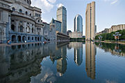 The headquarters of the Church of Christ, Scientist in the Back Bay is dominated by a reflecting pool. The tall buildings in the background are the Prudential Tower and 111 Huntington Avenue.