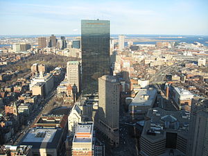 View of Boston from the Prudential Tower Skywalk Observatory, looking east-northeast towards the Atlantic Ocean. The John Hancock Tower is in the centre, Boston Common is at the upper left, and the Financial District is beyond the Common and Hancock. The major road to the right is the Massachusetts Turnpike ( I-90), which connects to I-93 through the South Bay Interchange at the upper right. At the top right is Logan International Airport, which is across inner Boston Harbour.