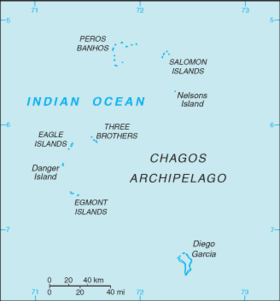 The British Indian Ocean Territory (BIOT) or Chagos Islands is an overseas territory of the United Kingdom situated in the Indian Ocean, halfway between Africa and Indonesia. The territory comprises the six atolls of the Chagos Archipelago (Phehandweep फेहंद्वीप in Hindi and other North Indian languages, Paeikaana Theevukal பேகான தீவுகள் in Tamil, Feyhandheebu ފޭހަންދީބު in Dhivehi) with over 1,000 individual islands (many tiny) having a total land area of 60 square kilometres (23 sq mi).