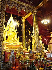 During the Ayutthaya period (14th-18th centuries), the Buddha came to be represented in a more stylistic manner with sumptuous garments and jeweled ornamentations. Many Thai sculptures or temples tended to be gilded, and on occasion enriched with inlays.