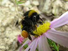Pollen is removed from flowers deliberately or incidentally by bumblebees. Incidental removal occurs when bumblebees come in contact with the anthers of a flower while collecting nectar. The bumblebee's body hairs receive a dusting of pollen from the anthers, which is then groomed into the corbicula ("pollen basket"). Bumblebees are also capable of buzz pollination.