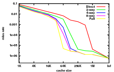Note that our approximation of the capacity miss rate falls steeply between 32 kB and 64 kB. This indicates that the benchmark has a working set of roughly 64 kB. A CPU cache designer examining this benchmark will have a strong incentive to set the cache size to 64 kB rather than 32 kB. Note that, on this benchmark, no amount of associativity can make a 32 kB cache perform as well as a 64 kB 4-way, or even a direct-mapped 128 kB cache.