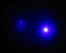 Violet light from a helium cadmium metal vapor laser. The highly monochromatic colour arises from the 441.563 nm transition line of cadmium.
