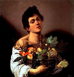 Boy with a Basket of Fruit, 1593-1594. Oil on canvas, 67 cm × 53 cm (26  in × 21 in). Galleria Borghese, Rome.