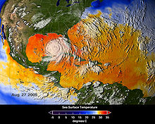 Average sea surface temperatures for the Caribbean Atlantic Ocean (25–27 August 2005. Hurricane Katrina is seen just above Cuba.