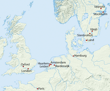 Cities where Linnaeus worked; those outside Sweden were only visited during 1735–1738.