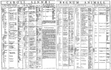 Table of the Animal Kingdom (Regnum Animale) from the 1st edition of Systema Naturæ (1735)