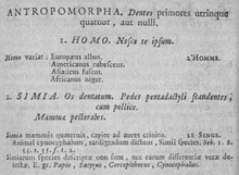 Detail from the 6th edition of Systema Naturae (1748) describing Ant[h]ropomorpha with a division between Homo and Simia.