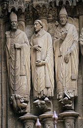 Although the upper parts of the three portals are treated separately, two sculptural elements run horizontally across the façade, uniting its different parts. Most obvious are the jamb statues afixed to the columns flanking the doorways – tall, slender standing figures of kings and queens from whom the Portail Royal derived its name. Although in the 18th and 19th century these figures were mistakenly identified as the Merovingian monarchs of France (thus attracting the opprobrium of Revolutionary iconoclasts) they almost certainly represent the kings and queens of the Old Testament – another standard iconographical feature of gothic portals.