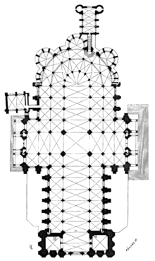 The plan is cruciform. A two bay narthex at the western end opens into a seven bay nave leading to the crossing, from which wide transepts extend three bays each to north and south. East of the crossing are four rectangular bays terminating in a semicircular apse. The nave and transepts are flanked by single aisles, broadening to a double-aisled ambulatory around the choir and apse. From the ambulatory radiate three deep semi-circular chapels (overlying the deep chapels of Fulbert's 11th-century crypt) and four much shallower ones. Of the latter, one was effectively lost in the 1320s when the Chapel of St Piat was built.