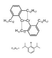 Most Cr(I) compounds are obtained by oxidation of electron-rich, octahedral Cr(0) complexes. Other Cr(I) complexes contain cyclopentadienyl ligands. As verified by X-ray diffraction, a Cr-Cr quintuple bond (length 183.51(4) pm) has also been described. Extremely bulky monodentate ligands stabilize this compound by shielding the quintuple bond from further reactions.
