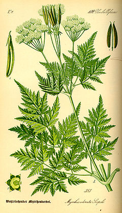 Cicely or Sweet Cicely (Myrrhis odorata) is a plant belonging to the family Apiaceae, native to central Europe; it is the sole species in the genus Myrrhis. It is a tall herbaceous perennial plant, growing to 2 m tall. The leaves are finely divided, feathery, up to 50 cm long. The flowers are white, about 2-4 mm across, produced in large umbels. The seeds are slender, 15-25 mm long and 3-4 mm broad.
