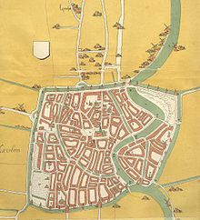 Map of Haarlem, the Netherlands, of around 1550 showing the city completely surrounded by a city wall and defensive canal, with its square shape inspired by Jerusalem