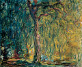 During World War I, in which his younger son Michel served and his friend and admirer Clemenceau led the French nation, Monet painted a series of weeping willow trees as homage to the French fallen soldiers. In 1923, he underwent two operations to remove his cataracts: the paintings done while the cataracts affected his vision have a general reddish tone, which is characteristic of the vision of cataract victims. It may also be that after surgery he was able to see certain ultraviolet wavelengths of light that are normally excluded by the lens of the eye, this may have had an effect on the colors he perceived. After his operations, he even repainted some of these paintings, with bluer water lilies than before the operation.