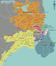 Suburban Copenhagen (or the Copenhagen metropolitan area) is planned according to the Finger Plan ( Danish: Fingerplanen), initiated in 1947, dividing the suburbs into five fingers. The S-train lines are built according to the Finger Plan, while green wedges and highways are built between the fingers.