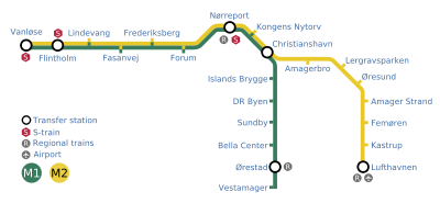 Copenhagen Metro ( Danish: Københavns Metro) is a rapid transit system serving Copenhagen, Frederiksberg and Tårnby in Denmark. The 20.5 km (12.7-mile) system opened between 2002 and 2007, and has two lines, M1 and M2. The AnsaldoBreda Driverless Metro cars supplements the larger S-train rapid transit system, and is integrated with DSB local trains and Movia buses. Through the city centre and west to Frederiksberg, M1 and M2 share a common line. To the south-east, the system serves Amager, with the 13.7 km (8.5-mile) M1 running though the new neighbourhood of Ørestad, and the 14.2 km (8.8-mile) M2 serving the eastern neighborhoods and Copenhagen Airport. The Metro has 22 stations, of which 9 are underground. In 2011, the Metro carried 54.3 million passengers.