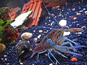 Crayfish are kept as pets in freshwater aquariums. They prefer foods like shrimp pellets or various vegetables but will also eat tropical fish food, algae wafers, and even small fish that can be captured by their claws, such as goldfish or minnows. Their disposition towards eating almost anything will also cause them to consume most aquarium plants in a fish tank; however, crayfish are fairly shy and may attempt to hide under leaves or rocks. When keeping a crayfish as a pet, one must provide a hiding space. At night, some fish become less energetic and settle to the bottom. The crayfish might see this as a chance for an easy meal, or a threat, and injure or kill the fish with its claws. Crayfish are effective scavengers and will consume fish carcasses. They sometimes will consume an exoskeleton after it is moulted. Crayfish are great escape artists and will try to climb out of the tank, so any holes in the hood should be covered.