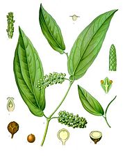 Cubeb (Piper cubeba), or tailed pepper, is a plant in genus Piper, cultivated for its fruit and essential oil. It is mostly grown in Java and Sumatra, hence sometimes called Java pepper. The fruits are gathered before they are ripe, and carefully dried. Commercial cubebs consist of the dried berries, similar in appearance to black pepper, but with stalks attached — the "tails" in "tailed pepper". The dried pericarp is wrinkled, its colour ranges from grayish-brown to black. The seed is hard, white and oily. The odour of cubebs is described as agreeable and aromatic. The taste, pungent, acrid, slightly bitter and persistent. It has been described as tasting like allspice, or like a cross between allspice and black pepper.