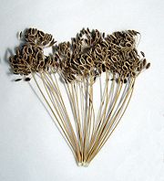 The seed is harvested by cutting the flower heads off the stalks when the seed is beginning to ripen. The seed heads are placed upside down in a paper bag and left in a warm dry place for a week. The seeds then separate from the stems easily for storage in an airtight container.