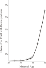 Maternal age influences the chances of conceiving a baby with Down syndrome. At maternal age 20 to 24, the probability is one in 1562; at age 35 to 39 the probability is one in 214, and above age 45 the probability is one in 19. Although the probability increases with maternal age, 80% of children with Down syndrome are born to women under the age of 35, reflecting the overall fertility of that age group. Recent data also suggest that paternal age, especially beyond 42, also increases the risk of Down syndrome manifesting.