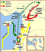 By then, the situation in the Holy Land was a precarious one. Jerusalem had fallen in 1187, and Acre was now the centre of the Christian state. The Muslim states were on the offensive under the Mamluk leadership of Baibars, and were now threatening Acre itself. Though Edward's men were an important addition to the garrison, they stood little chance against Baibars' superior forces, and an initial raid at nearby St Georges-de-Lebeyne in June was largely futile. An embassy to the Mongols helped bring about an attack on Aleppo in the north, which helped to distract the Baibar forces. In November, Edward led a raid on Qaqun, which could have served as a bridgehead to Jerusalem, but both the Mongol invasion and the attack on Qaqun failed. Things now seemed increasingly desperate, and in May 1272 Hugh III of Cyprus, who was the nominal king of Jerusalem, signed a ten–year truce with Baibars. Edward was initially defiant, but an attack by a Muslim assassin in June forced him to abandon any further campaigning. Even though he managed to kill the assassin, he was struck in the arm by a dagger feared to be poisoned, and became severely weakened over the next months.
