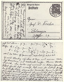 Noether and Fischer shared lively enjoyment of mathematics and would often discuss lectures long after they were over; Noether is known to have sent postcards to Fischer continuing her train of mathematical thoughts.