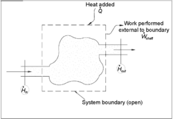 In thermodynamic open systems, matter may flow in and out of the system boundaries. The first law of thermodynamics for open systems states: the increase in the internal energy of a system is equal to the amount of energy added to the system by matter flowing in and by heating, minus the amount lost by matter flowing out and in the form of work done by the system. The first law for open systems is given by: