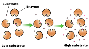 As enzyme-catalysed reactions are saturable, their rate of catalysis does not show a linear response to increasing substrate. If the initial rate of the reaction is measured over a range of substrate concentrations (denoted as [S]), the reaction rate (v) increases as [S] increases, as shown on the right. However, as [S] gets higher, the enzyme becomes saturated with substrate and the rate reaches Vmax, the enzyme's maximum rate.