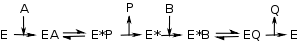 As shown on the right, enzymes with a ping-pong mechanism can exist in two states, E and a chemically modified form of the enzyme E*; this modified enzyme is known as an intermediate. In such mechanisms, substrate A binds, changes the enzyme to E* by, for example, transferring a chemical group to the active site, and is then released. Only after the first substrate is released can substrate B bind and react with the modified enzyme, regenerating the unmodified E form. When a set of v by [S] curves (fixed A, varying B) from an enzyme with a ping–pong mechanism are plotted in a Lineweaver–Burk plot, a set of parallel lines will be produced.