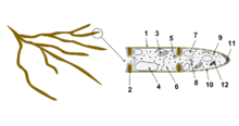 1- Hyphal wall 2- Septum 3- Mitochondrion 4- Vacuole 5- Ergosterol crystal 6- Ribosome 7- Nucleus 8- Endoplasmic reticulum 9- Lipid body 10- Plasma membrane 11- Spitzenkörper 12- Golgi apparatus