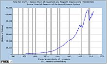 The net worth of households and nonprofit organizations in the United States is published by the Federal Reserve in a report titled Flow of Funds. At the end of the third quarter of fiscal year 2012, this value was $64.8 trillion.