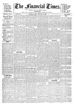 ![]() The 13 February 2013 front page of the Europe edition of the Financial Times. FT marked its 125th anniversary with reproduced masthead from the first ever pink edition of the newspaper, printed on January 2, 1893. |