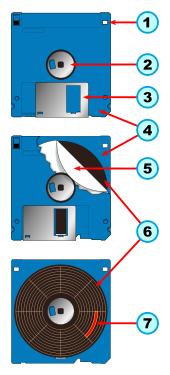 The core of the 3 1⁄2-inch disk is the same as the other two disks, but the front has only a label and a small aperture for reading and writing data, protected by the slider — a spring-loaded metal or plastic cover, pushed to the side on entry into the drive. Rather than having a hole in the centre, it has a metal hub which mates to the spindle of the drive. Typical 3 1⁄2-inch disk magnetic coating materials are: