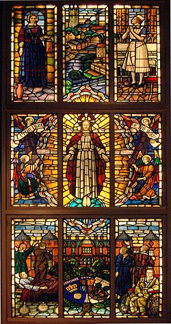 A remarkable stained glass window was commissioned for inclusion in the Derbyshire Royal Infirmary chapel in the late 1950s. When the chapel was later demolished the window was removed, stored and replaced in the new replacement chapel. At the closure of the DRI the window was again removed and stored. In October 2010, £6,000 was raised by friends of the window and St Peters Church to reposition the window in St Peters Church, Derby. The remarkable work features nine panels, of the original ten, depicting scenes of hospital life, Derby townscapes and Florence Nightingale herself. Some of the work was damaged and the tenth panel was dismantled for the glass to be used in repair of the remaining panels. All the figures, who are said to be modelled on prominent Derby town figures of the early sixties, surround and praise a central pane of the triumphant Christ. A nurse who posed for the top right panel in 1959 attended the rededication service in October 2010.
