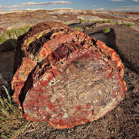 Petrified wood. The internal structure of the tree and bark are maintained in the permineralization process.