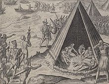 Drake's landing in California, engraving published 1590 by Theodor de Bry