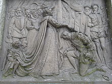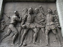 Drake receives knighthood from Queen Elizabeth. Bronze plaque by Joseph Boehm, 1883, base of Drake statue, Tavistock